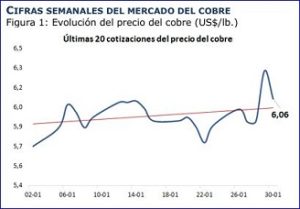 - El metal rojo cerró la última semana de enero con un alza de 3,5%, llegando a US$ 6,06 la libra y marcando un hito en los mercados internacionales.