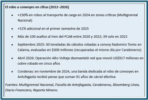 Dentro de ese universo, los convoyes son el objetivo más codiciado. El Ferrocarril de Antofagasta a Bolivia (FCAB) —operador de más de 700 kilómetros de vía férrea y proveedor de transporte para siete grandes faenas mineras— registró más de 100 asaltos entre 2020 y 2022, con un peak de 39 ataques solo en 2022. En septiembre de 2025, un convoy que salía desde la mina Radomiro Tomic de Codelco fue interceptado en la ruta B-50 y perdió 30 toneladas de cátodos avaluadas en 300 millones de pesos. Dos meses después, en las pampas de Baquedano, Carabineros recuperó 110 láminas de cobre enterradas en el desierto —robadas desde un tren del FCAB en movimiento. Y en abril de 2026, el mayor golpe a una red de contrabando de cobre en la historia del país: la Operación Alto Voltaje desmanteló una organización que durante cinco años movió cerca de US$917 millones en cobre robado, exportándolo principalmente a China.
