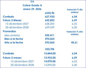 En este contexto, la agencia especializada Trading Economics, reportó al cierre de la jornada de ayer: “Los futuros del cobre en EE. UU. subieron más del 10% hasta alcanzar un máximo histórico de 6,5 dólares por libra antes de recortar las ganancias a 6,2 dólares, en línea con una sesión volátil para los metales, ya que los mercados evaluaron los fundamentos detrás del reciente repunte especulativo”